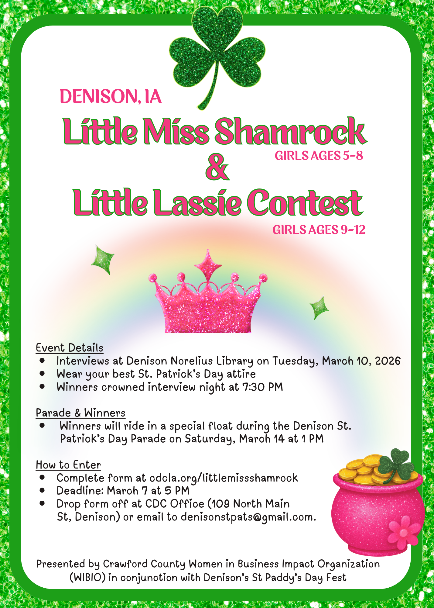 The contest will take place on Tuesday, March 10, 2026, at the Denison Norelius Library. Following the interviews, winners will be crowned at 7:30 PM. The newly crowned Little Miss Shamrock and Little Lassie will then represent Denison by riding in the Denison St. Patrick’s Day Parade on Saturday, March 14, 2026, at 1:00 PM.