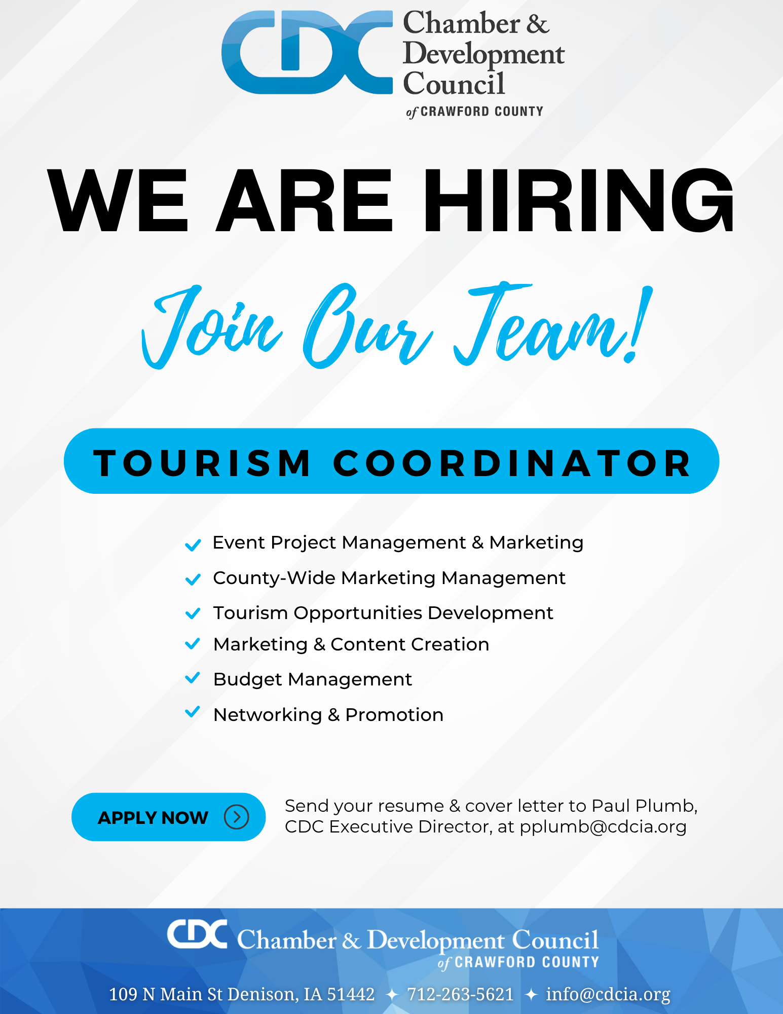 The CDC Tourism Coordinator will lead efforts to enhance, promote, and facilitate tourism throughout Denison and Crawford County. As the key advocate for tourism, this role involves a wide range of responsibilities aimed at maximizing the area’s appeal to visitors.